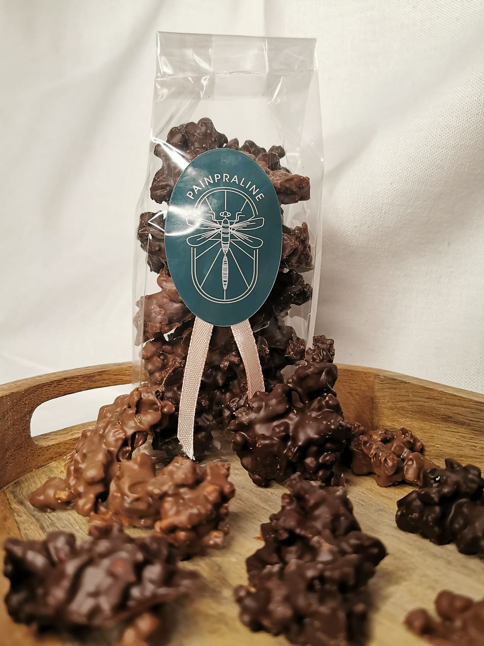 Chocolat noir 66 %, pécan caramélisée, myrtille séchée, amande caramélisée, fleur de bruyère​